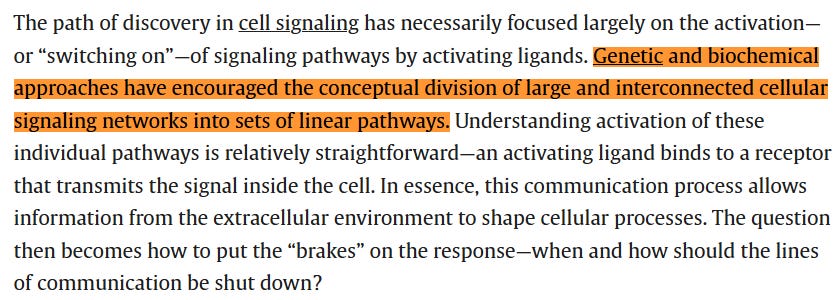 “Genetic and biochemical approaches have encouraged the conceptual division of large and interconnected cellular signaling networks into sets of linear pathways.”