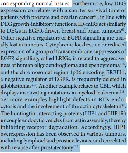 “Furthermore, low DEG expression correlates with a shorter survival time of patients with prostate and ovarian cancer, in line with DEG growth-inhibitory functions. ID-miRs act similarly to DEGs in EGFR-driven breast and brain tumours. Other negative regulators of EGFR signalling are usually lost in tumours. Cytoplasmic localization or reduced expression of a group of transmembrane suppressors of EGFR signalling, called LRIGs, is related to aggressiveness of human oligodendroglioma and ependymoma, and the chromosomal region 1p36 encoding ERRFI1, a negative regulator of EGFR, is frequently deleted in glioblastomas. Another example relates to CBL, which displays inactivating mutations in myeloid leukaemia. Yet more examples highlight defects in RTK endocytosis and the involvement of the actin cytoskeleton. The huntingtin-interacting proteins (HIP1 and HIP1R) uncouple endocytic vesicles from actin assembly, thereby inhibiting receptor degradation. Accordingly, HIP1 overexpression has been observed in various tumours, including lymphoid and prostate lesions, and correlated with relapse after prostatectomy.”