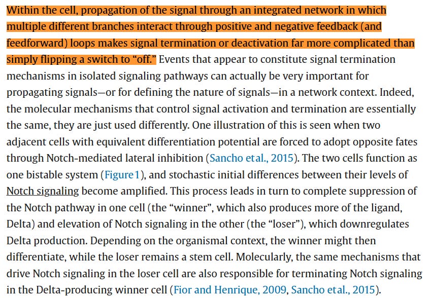 “Within the cell, propagation of the signal through an integrated network in which multiple different branches interact through positive and negative feedback … makes signal termination or deactivation far more complicated than simply flipping a switch to ‘off’.”