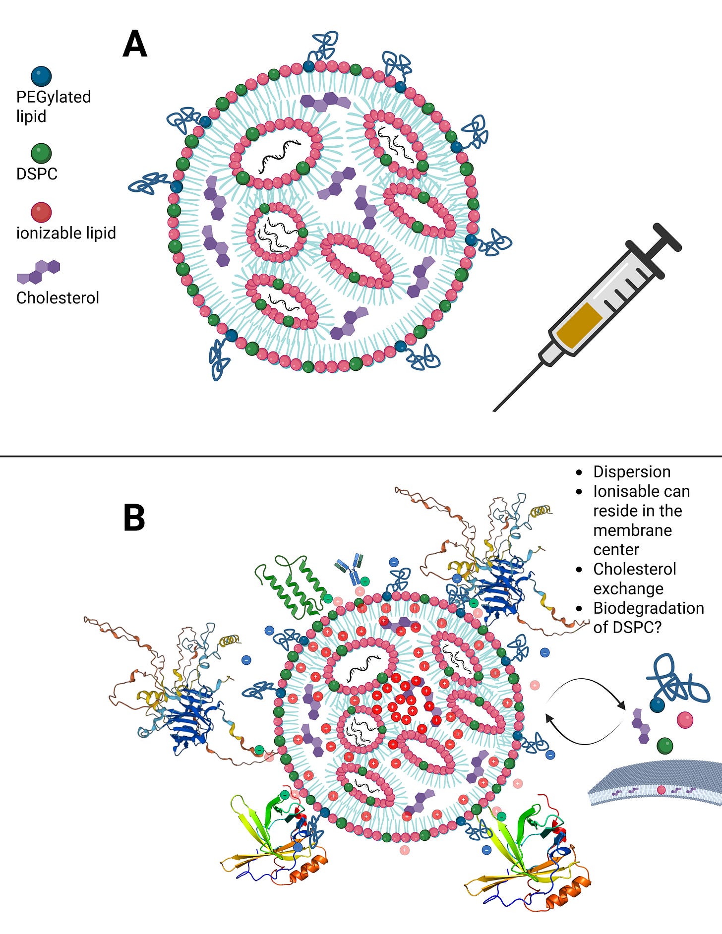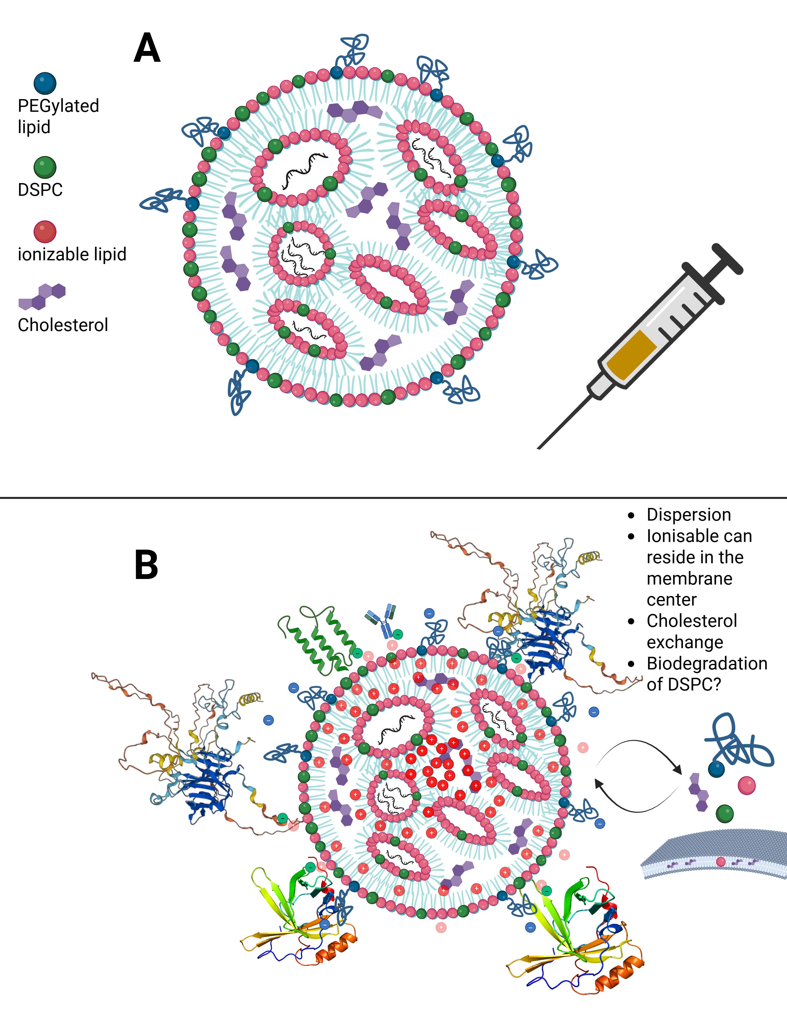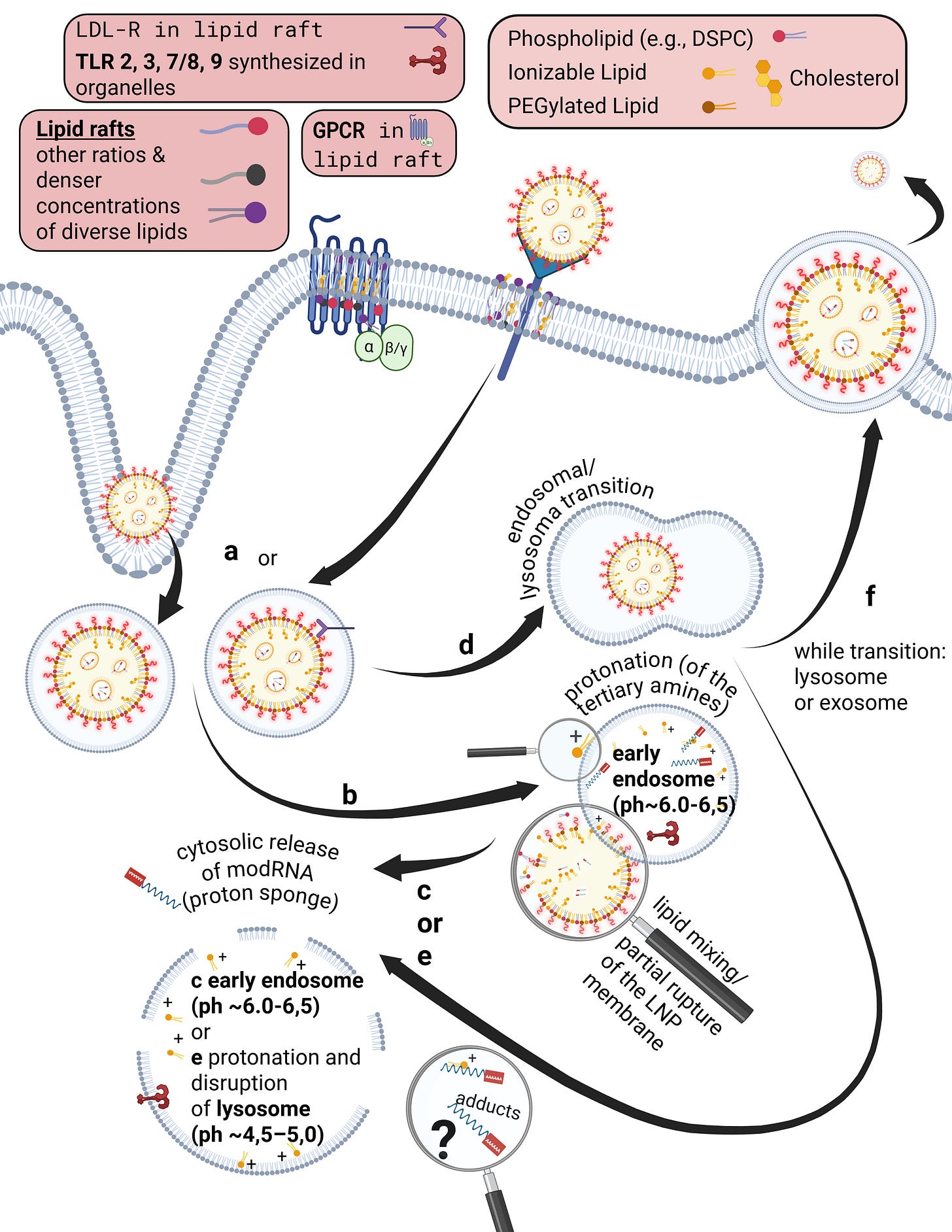 This means that there is always a minimal scaffold on which further processes build. It is not the case that everything disintegrates completely and is then reassembled from scratch. For example, Liu et al., and in particular Liau et al., demonstrated using scanning electrochemical microscopy that the PEGylated lipid detaches first, followed by the ionizable lipid, and finally DSPC, leaving only cholesterol and the modRNA behind. In addition, cholesterol exchange occurs during LNP uptake. More on this later.