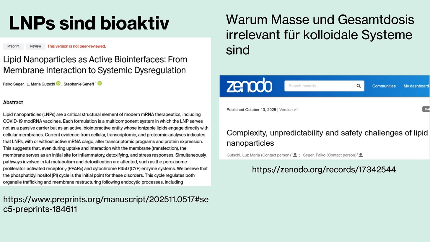 If you have been able to follow up to this point and understand at least the essentials, then you will understand why the greatest error lay—and still lies—in treating modRNA and LNPs as separate entities, and why traditional pharmacological notions of a simple “mass × total molecule number equals toxic effect” model fail to apply.