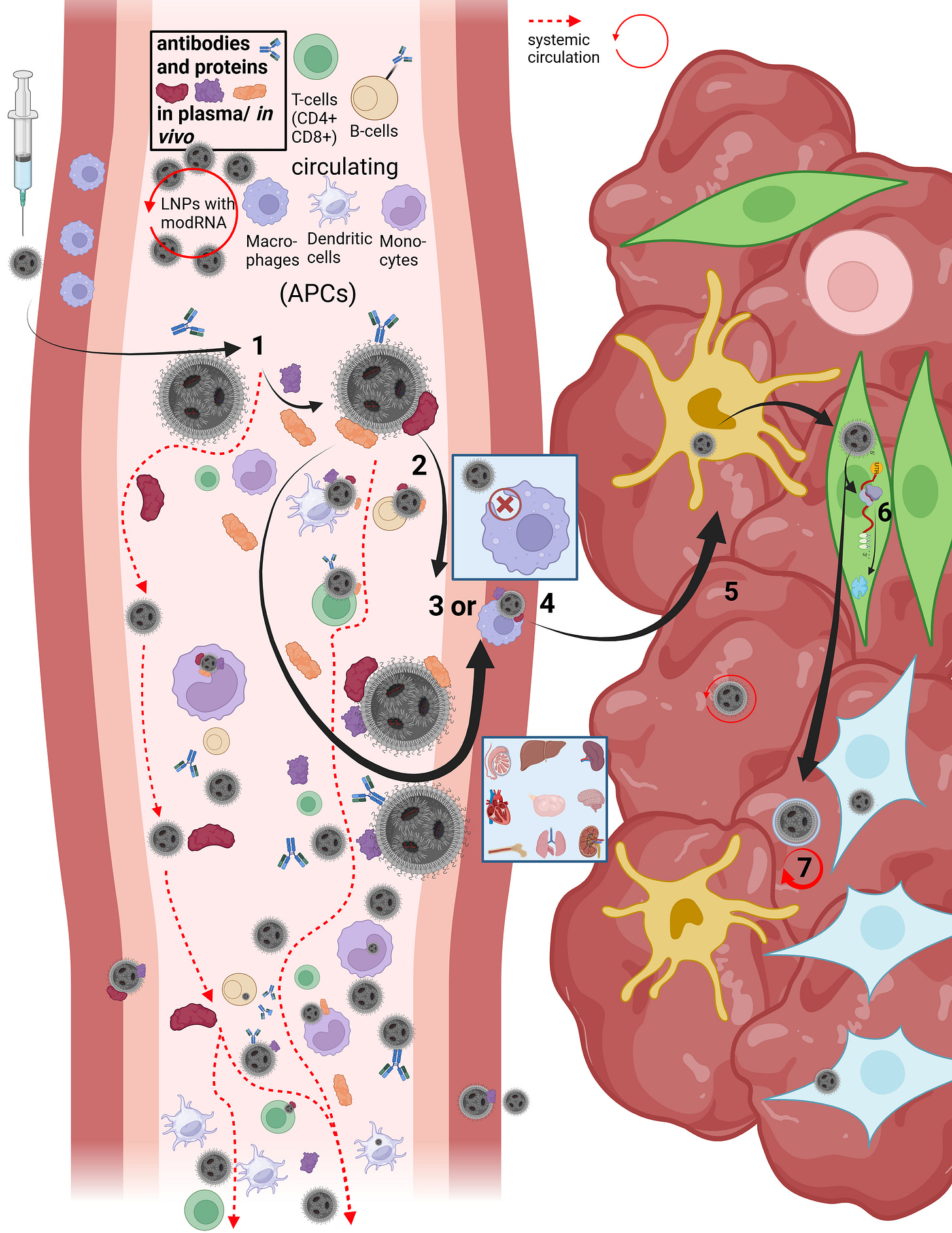 Now that we better understand how LNPs can enter the circulation at all, it becomes clear that the restructuring and individualization of each single particle necessarily affects uptake pathways across different cell types. The frequently used statement that “LNPs distribute throughout the entire body” therefore falls short, as it neither describes how this occurs nor what happens afterward. We now turn to steps 3 through 7.