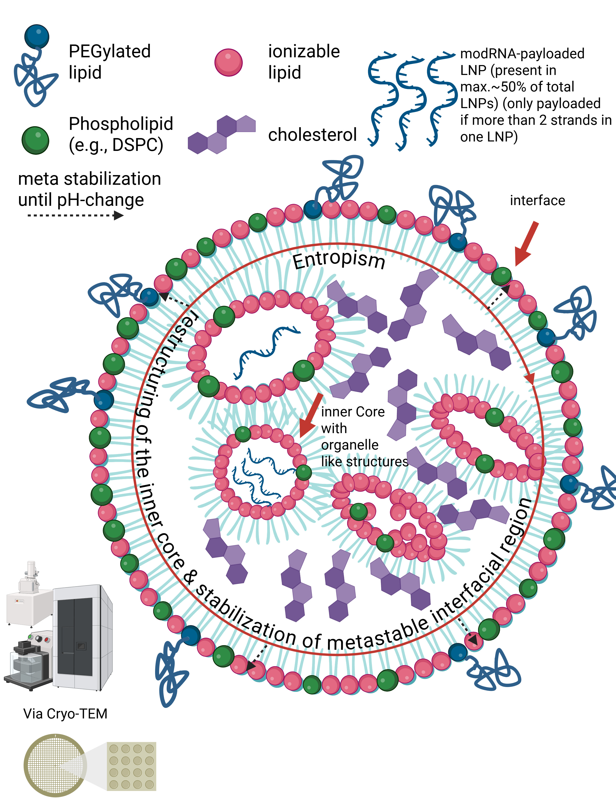 In other words, the internal region of LNPs does not form classical structural layers in the sense of lipid bilayers. Instead, the modRNA is embedded in an amorphous, dynamic core of ionizable lipids, stabilized by an interplay of electrostatic interactions, hydrophobic effects, counter-ion binding, and entropic forces. The outer lipid layers are therefore not mechanically supported by internal “layers,” but represent an autonomous, metastable interfacial phase.