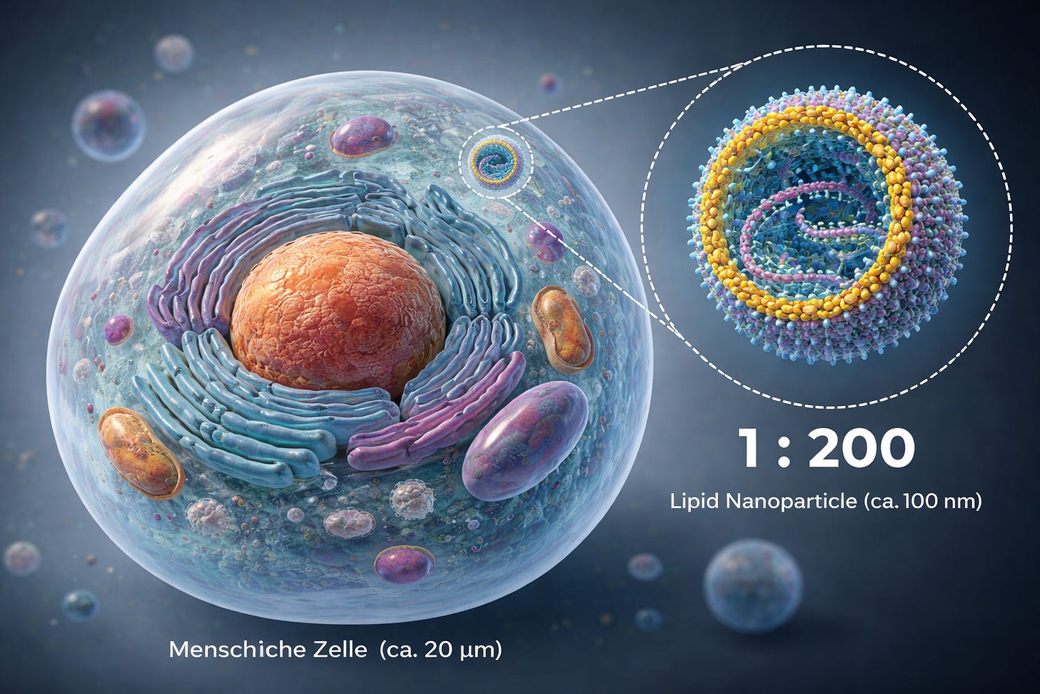 We are talking about liquid droplets that form a construct which, relative to the cell it enters and into which it releases its cargo—the modRNA—behaves, purely in terms of size differences, roughly like a soccer player on a soccer field.
