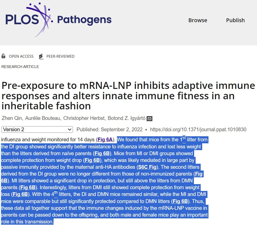 In an extensive mouse experiment by Qin et al., it was shown that even mere exposure—that is, contact with empty LNPs as currently used—led to markedly altered immune responses to viral and bacterial pathogens in the mice. Furthermore, the experiment demonstrated that this effect was transmitted to the next mouse generation, as would be expected if profound epigenetic changes were involved.